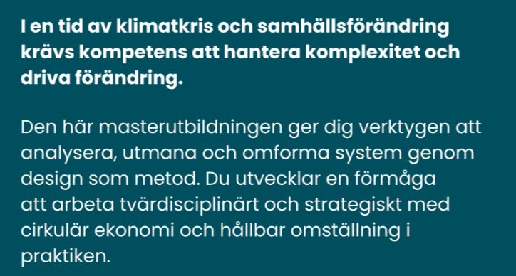 Vill verkligen tipsa om denna master där ansökningen nu har öppnat (fram till den 24 mars). Jag är med på ett hörn och har fått varit tidigare år. Den leds av Emma Westerlund som är fantastisk på alla sätt och gillar att både pröva nytt och dra saker till sin spets. Med det sagt så har hon drömmar om att få den cirkulära utbildningen att handla om så mycket mer än att fastna i befintliga system utan kansek ännu mer hur ska vi navigera den här framtiden vi är på väg in i - vad behöver vi för komponenter då?